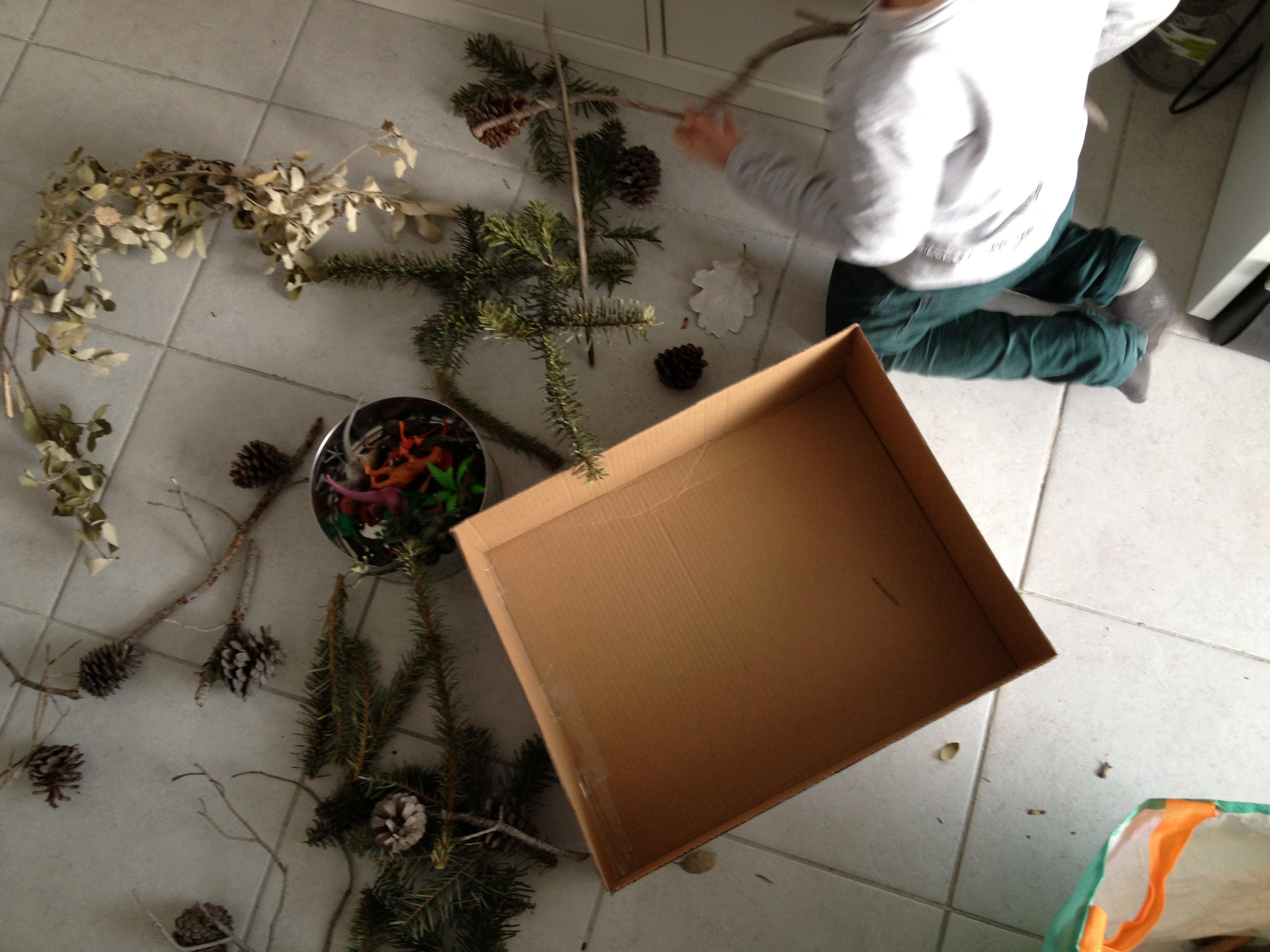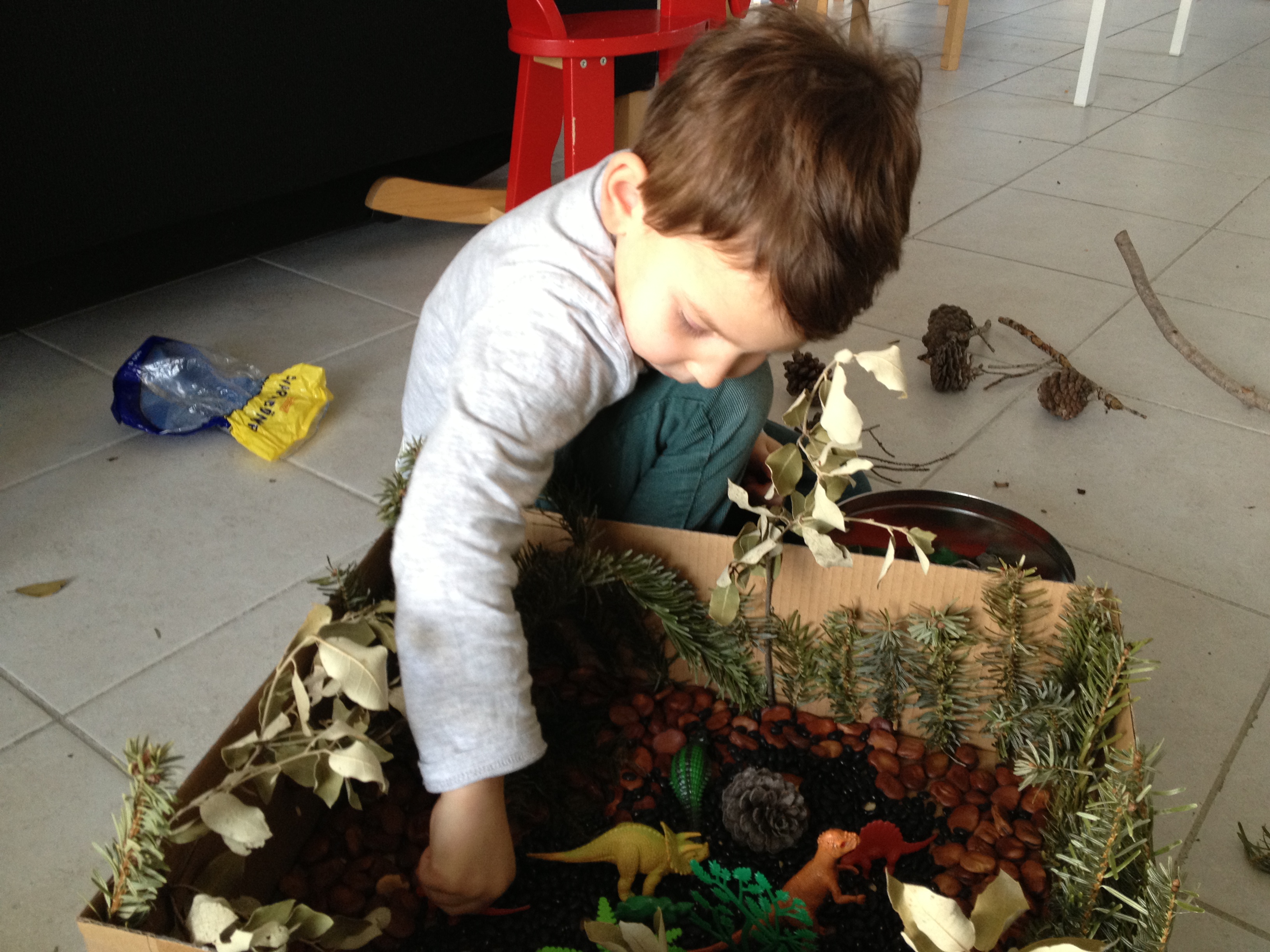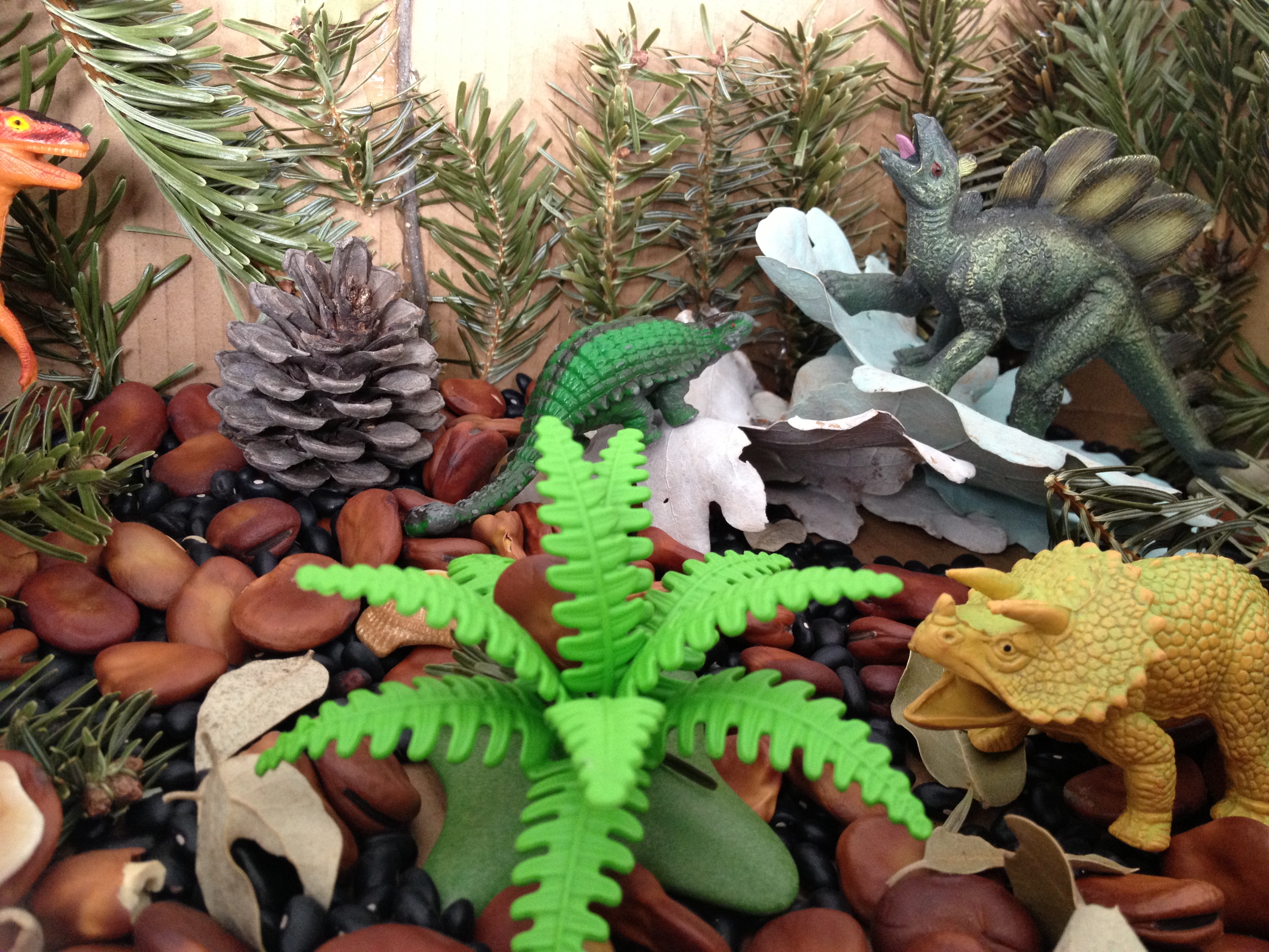 Hot glue the twigs, leaves, etc. to your box. Next, add beans- lighter colors allow for the dinosaurs to be seen more clearly.