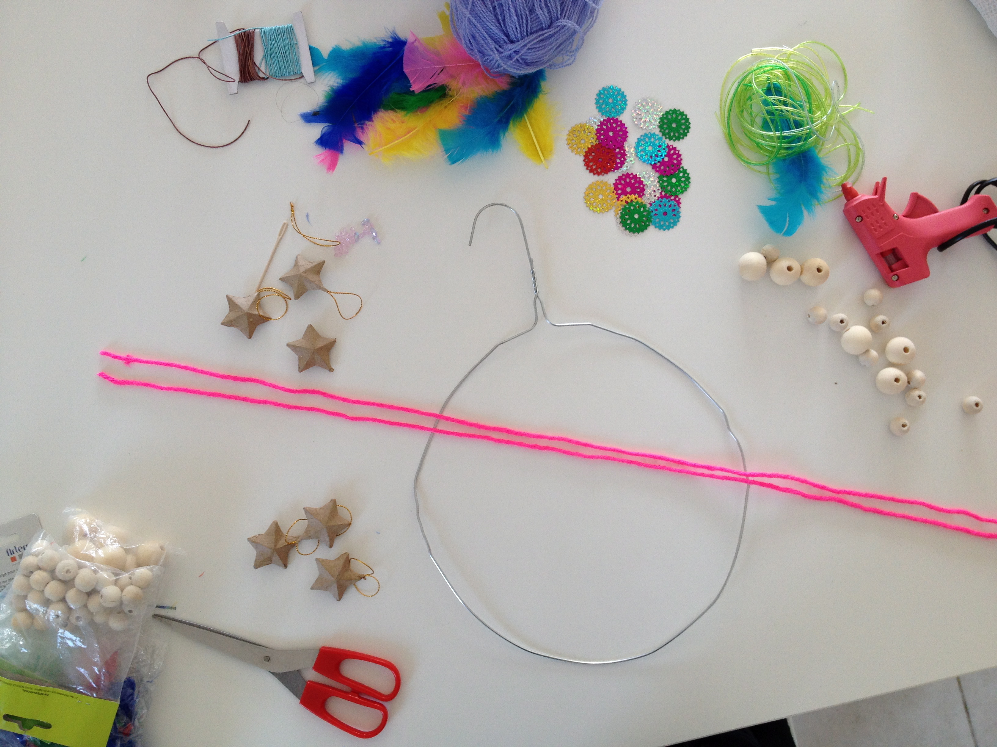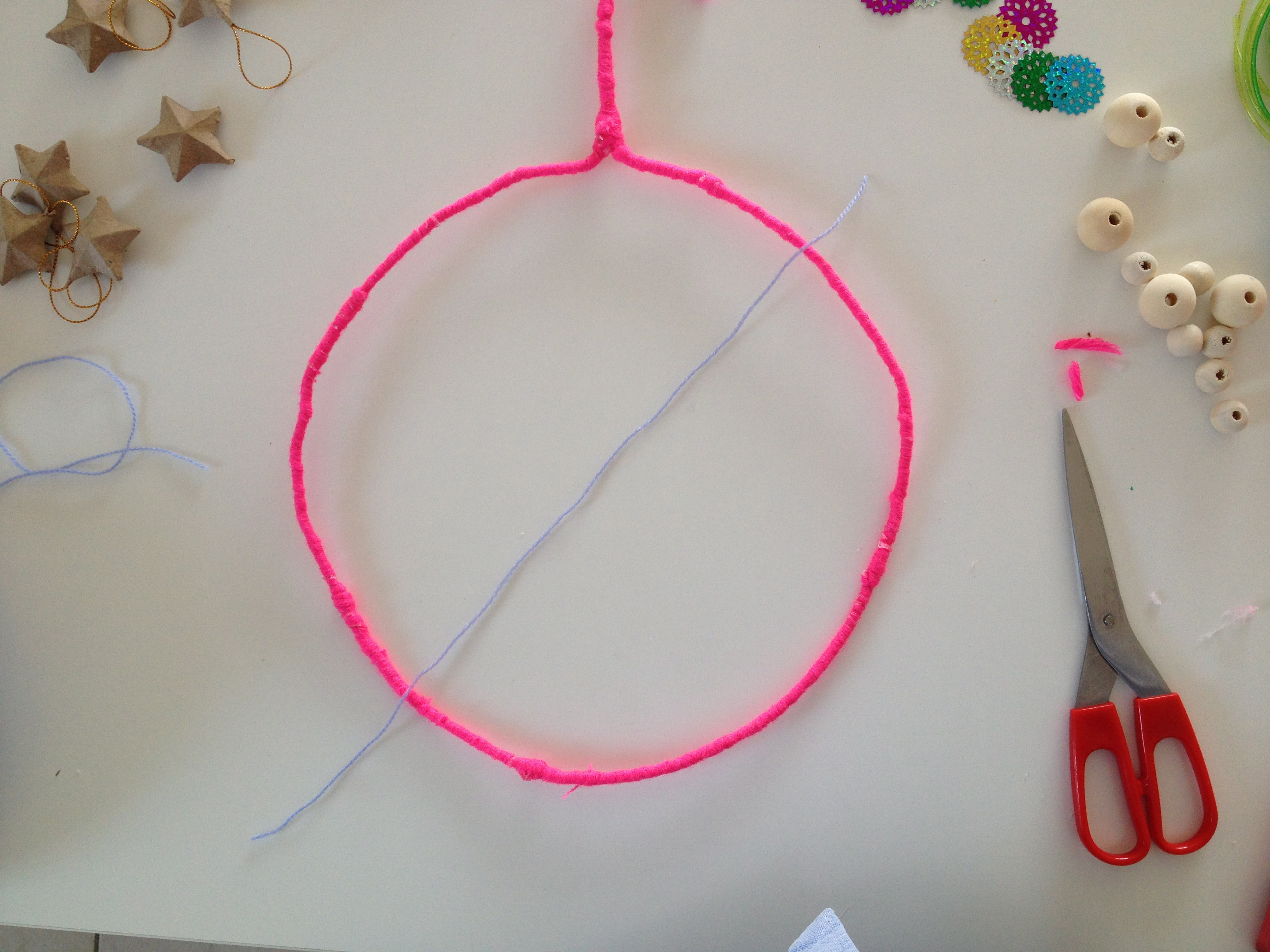 Dream catcher by Learn and Play en Anglais……Use a tea towel to help you manipulate the wire without hurting your hands.Cut a long piece of yarn and fold it in half.