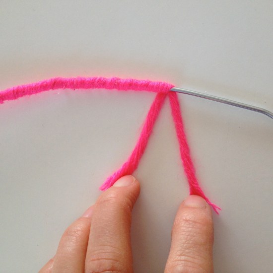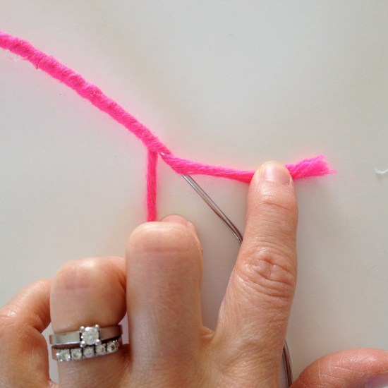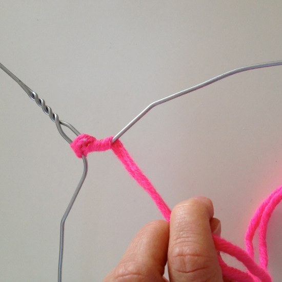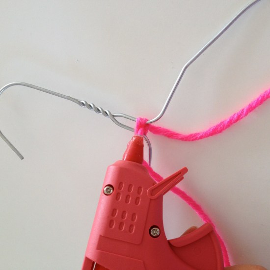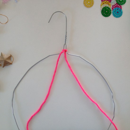 Start with a new piece of yarn and knot it just above your previous knot.Add some hot glue before making another knot so as to hold it in place.Now continue to wrap the yarn around the wire, making knots and adding glue as needed……until you are all done.cut a piece of yarn that is longer than the diameter of your circle