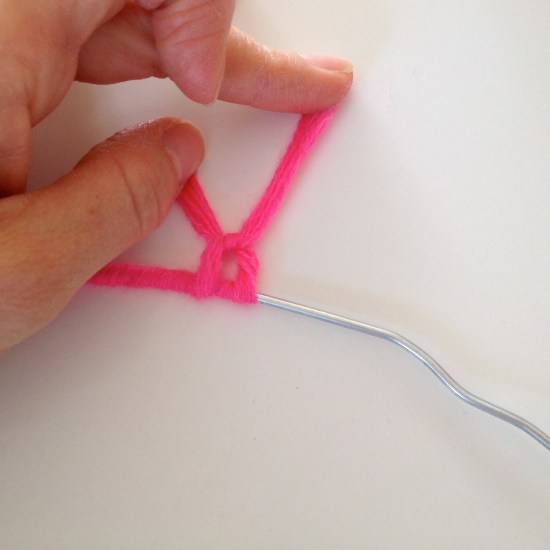 After decorating one half of your second piece of yarn, wrap it around the middle string…