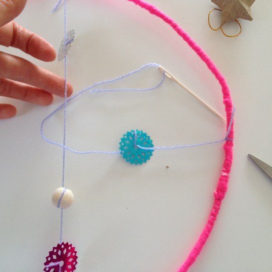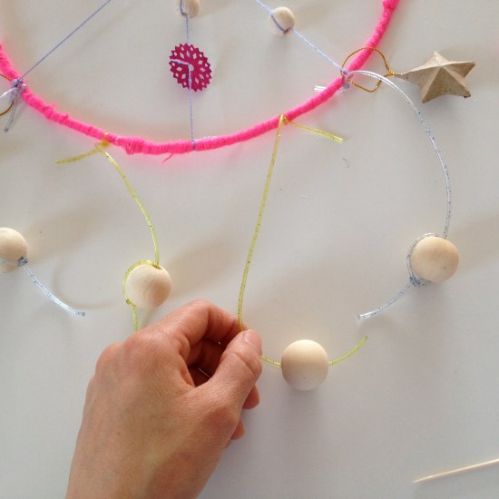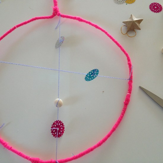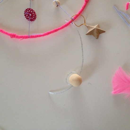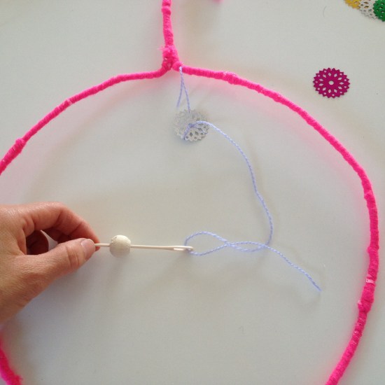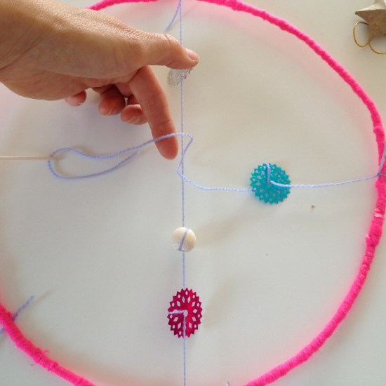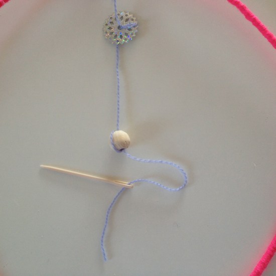 Tie the yarn to one end of your dream catcher and attach beads, buttons, etc. for decoration.