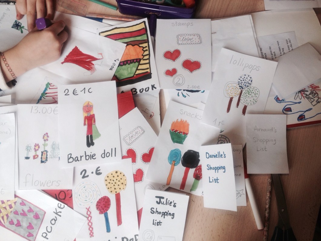 We then quickly moved on to adding up different sums and they really enjoyed showing off their ever growing math skills. I then asked them to pick out a particular item to sell and to then choose a price to sell it at. Working in pairs they took turns asking, “How much does this cost.” ” It’s costs # euros and # cents. ” Whereby their partner would answer, “That’s expensive!” or one of the other phrases.